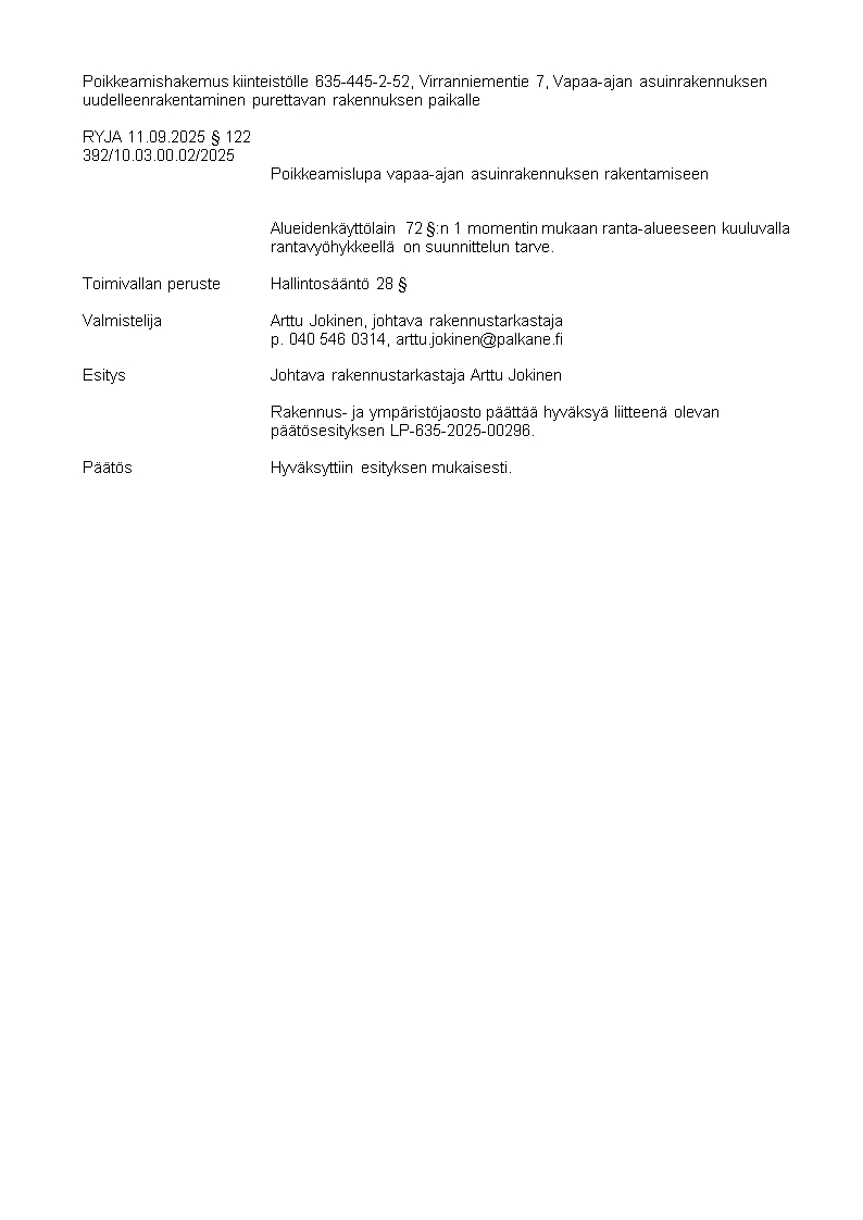 Pöytäkirja 11.09.2025/Pykälä 122