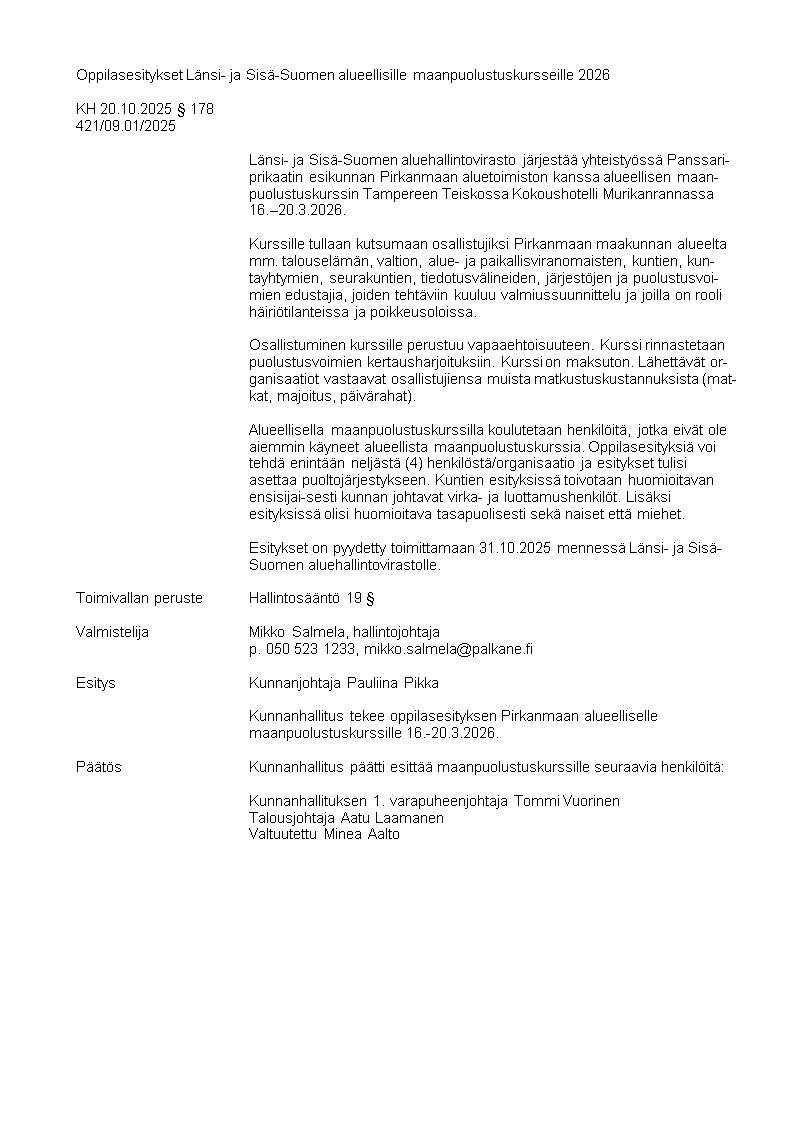 Pöytäkirja 20.10.2025/Pykälä 178