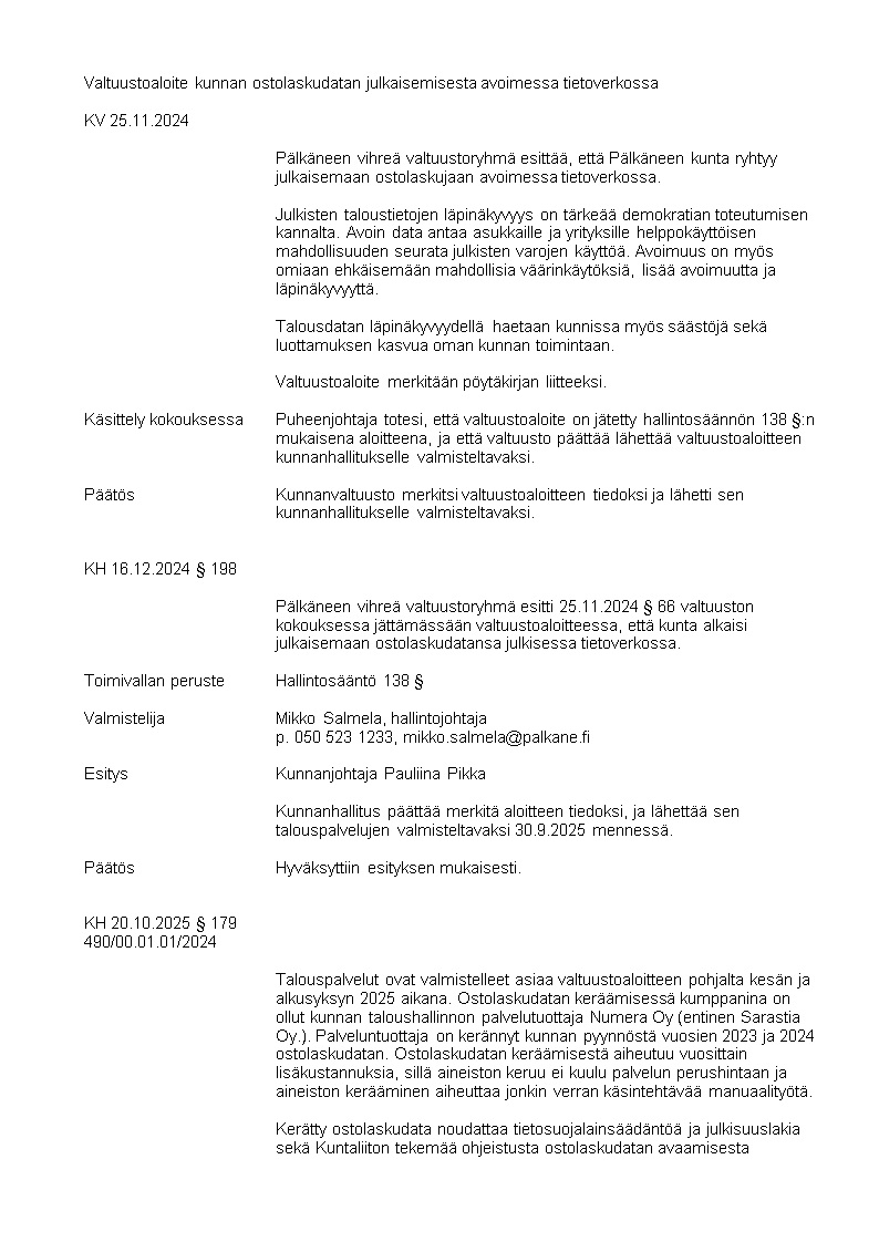 | 10 | Valtuustoaloite kunnan ostodatan julkaisemisesta avoimessa tietoverkossa, Vihreä valtuustoryhmä 25.11.2024 |