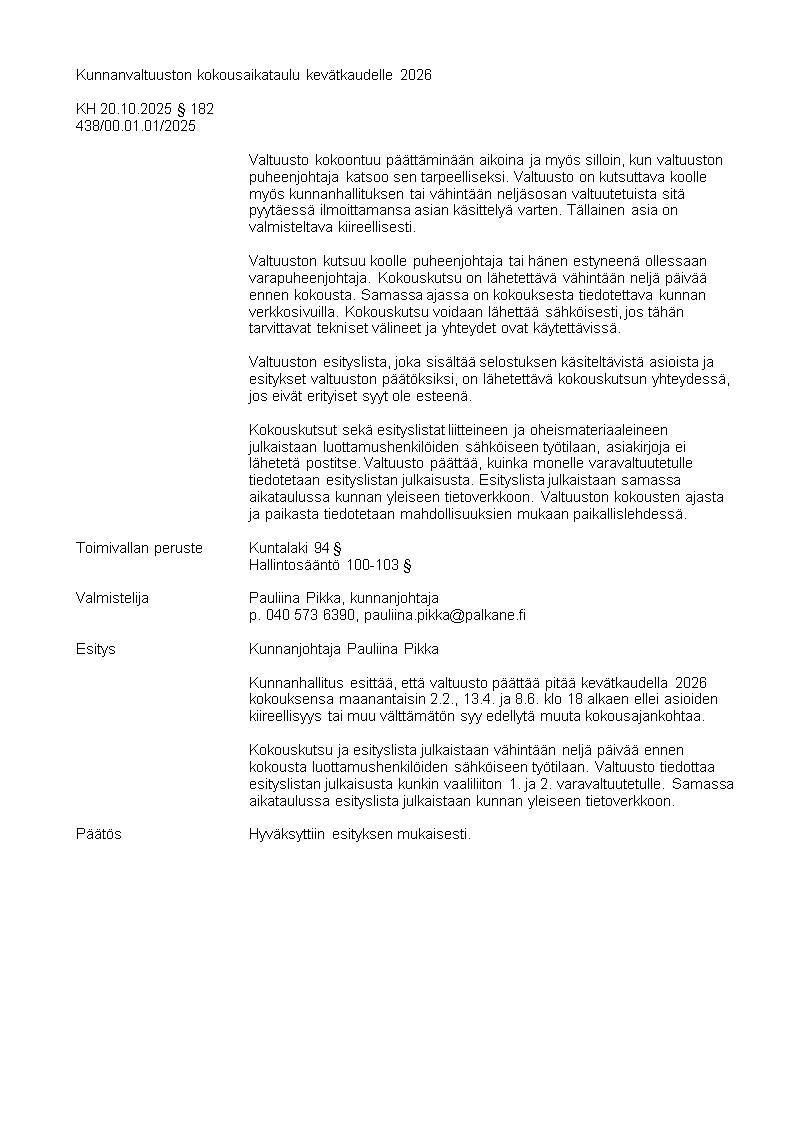 Pöytäkirja 20.10.2025/Pykälä 182