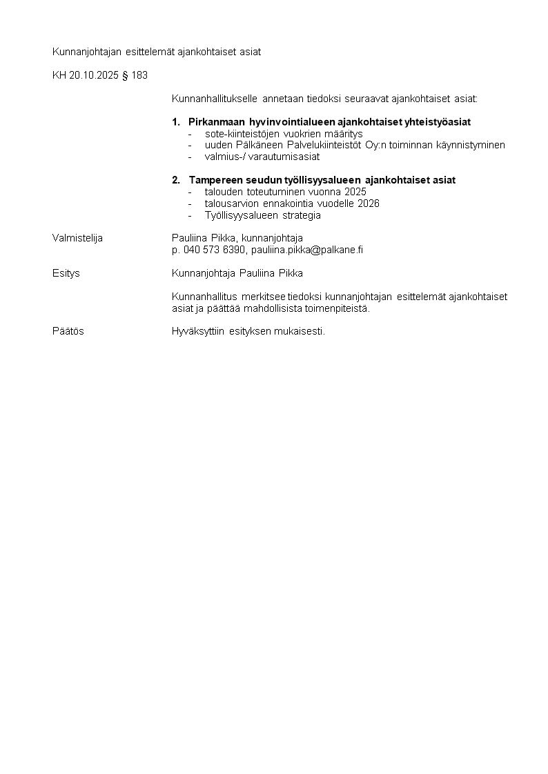 Pöytäkirja 20.10.2025/Pykälä 183