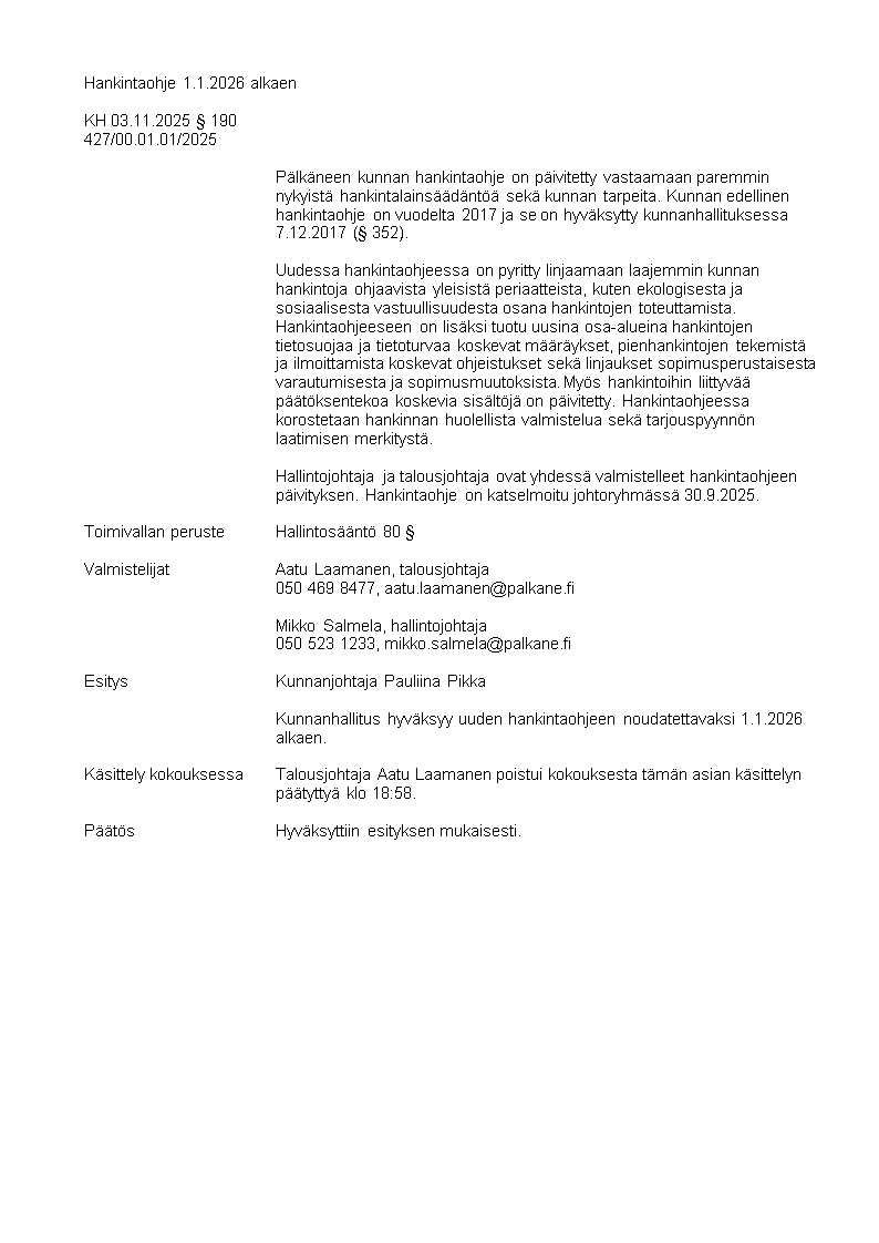 Pöytäkirja 03.11.2025/Pykälä 190