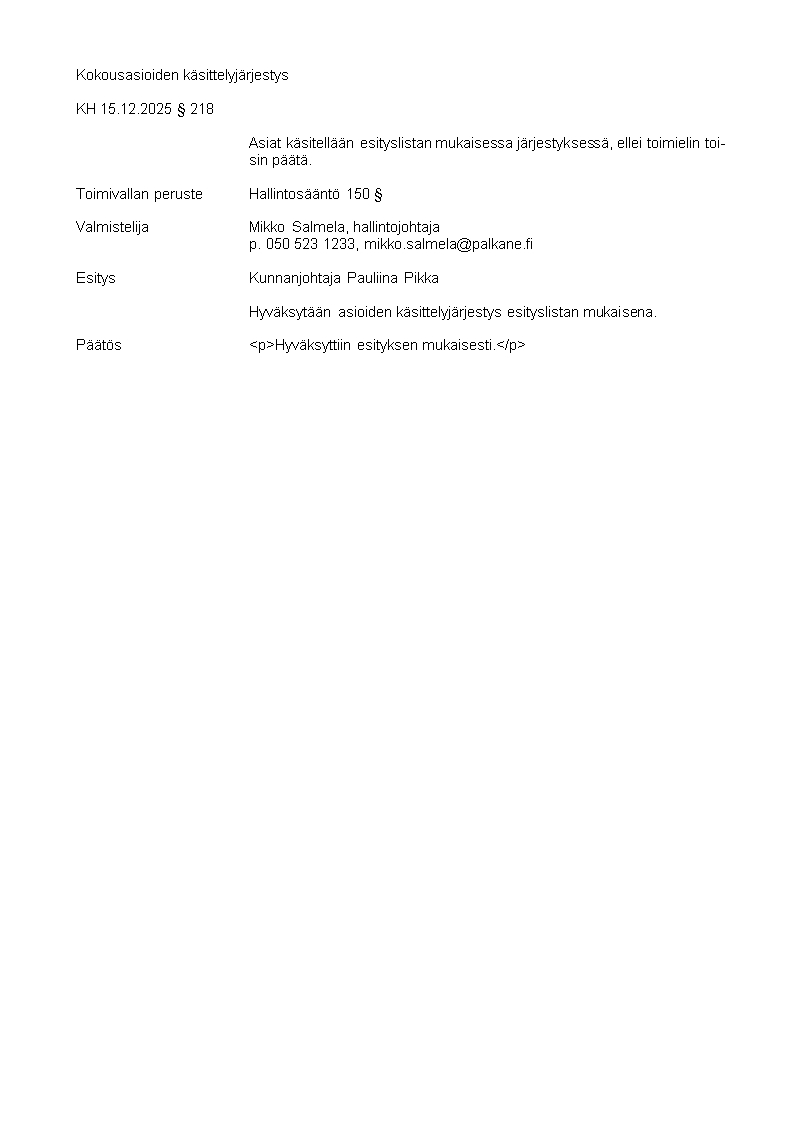 Pöytäkirja 15.12.2025/Pykälä 218